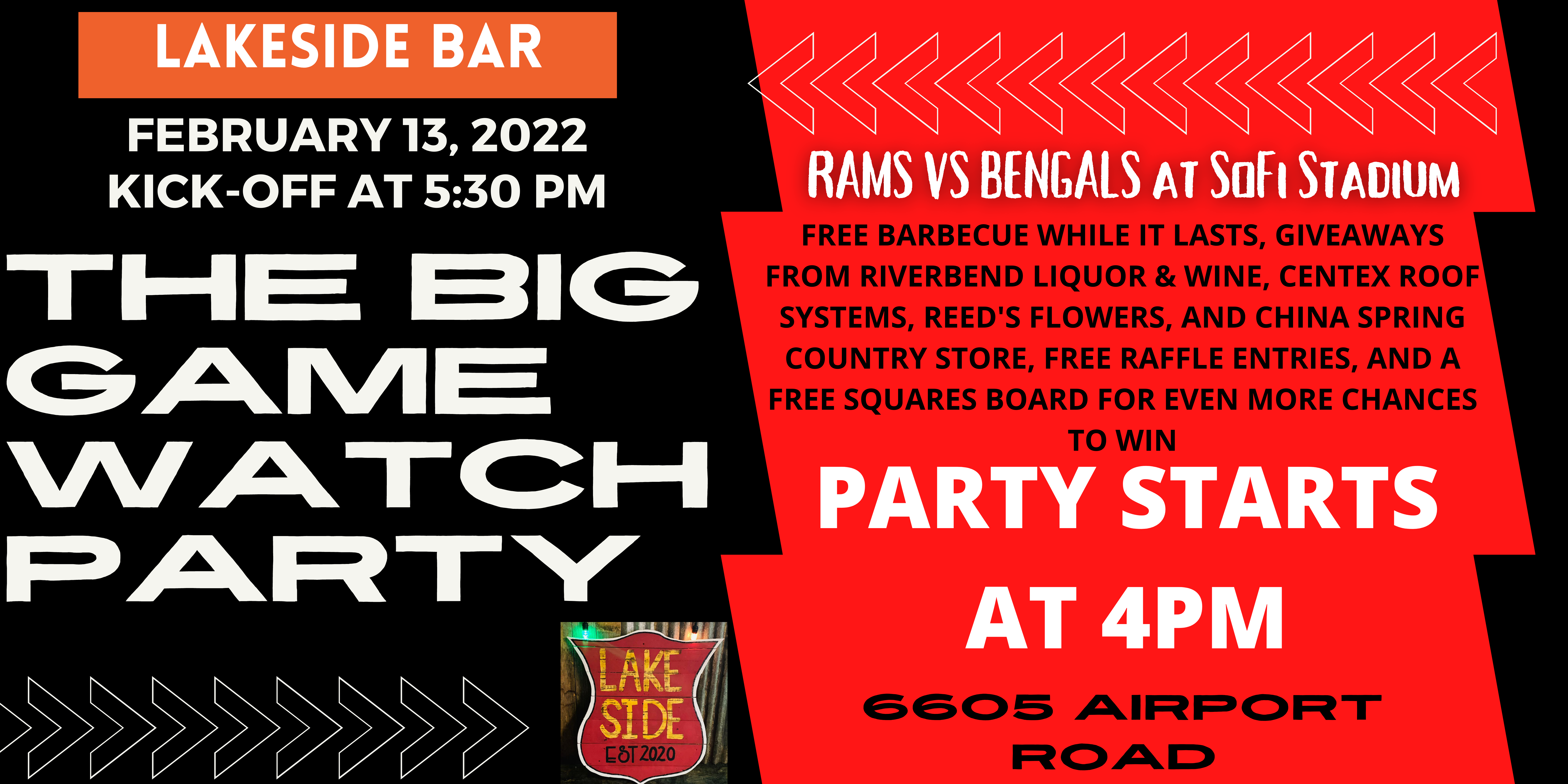 DRINK SPECIALS, SURPRISE HALFTIME GIVEAWAY AND MORE! YOU DON’T WANT TO MISS THIS! KICKOFF IS AT 5:30, SO GET THERE EARLY! THIS SUNDAY THE 13TH AT LAKESIDE! 6605 AIRPORT ROAD